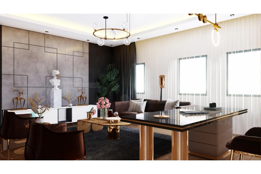 un espace de travail luxueux à décor contemporain, un loft sombre et des accents d'or par AMC ARCHITECTURE COMPANY.