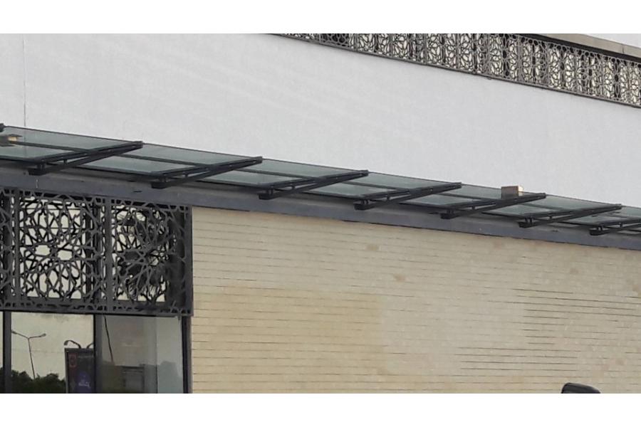 Fabrication et montage d’un auvent de 42ml*2m en verre feuilleté 2*6mm avec structure métallique galvanisé en fer plat de 2cm
