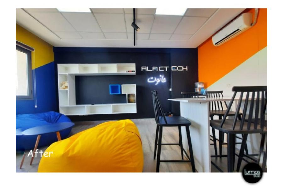 Aménagement d'un Open Space conçu comme étant un fun space pour investir dans le bien être de son équipe et viser leur meilleur rendement. Un design coloré en aménagement sensoriel sous la demande du maître de l'ouvrage.